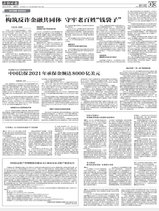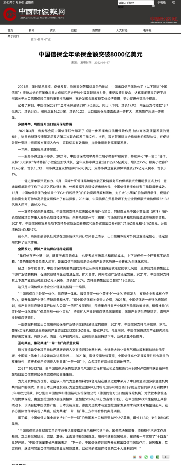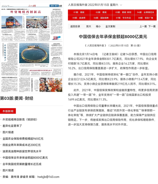 1月14日,公司在全系統開展年度業績主題宣傳活動。截至目前,《人民日報》、《人民日報》(海外版)、新華社、《經濟日報日報》、《經濟參考報》、《中國財經報》、《中國銀行保險報》、新華網、中國網、《中國報道》等媒體報道和轉載604篇。上述報道通過最新數據和多個角度肯定了公司2021年堅持從黨的百年奮斗重大成就和歷史經驗中汲取智慧與力量,牢記政策性使命,認真貫徹落實習近平總書記關于出口信用保險工作的重要指示精神,充分發揮金融支持實體經濟作用,堅持穩中求進工作總基調,立足新發展階段,完整、準確、全面貫徹新發展理念,服務構建新發展格局的重要作用。截至發稿時,新聞媒體仍在持續報道中。以下是部分媒體報道截圖: