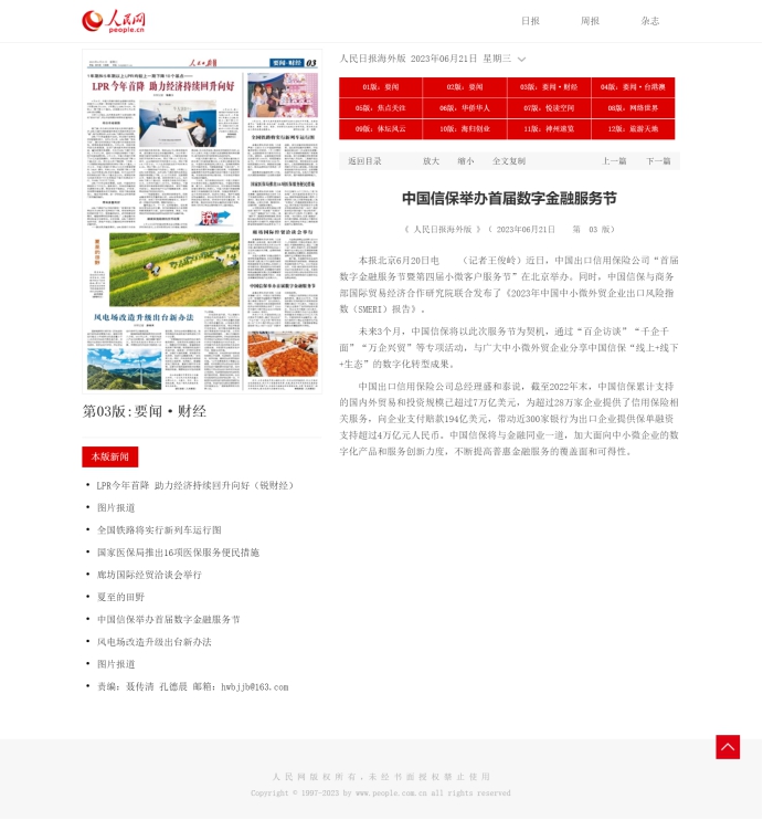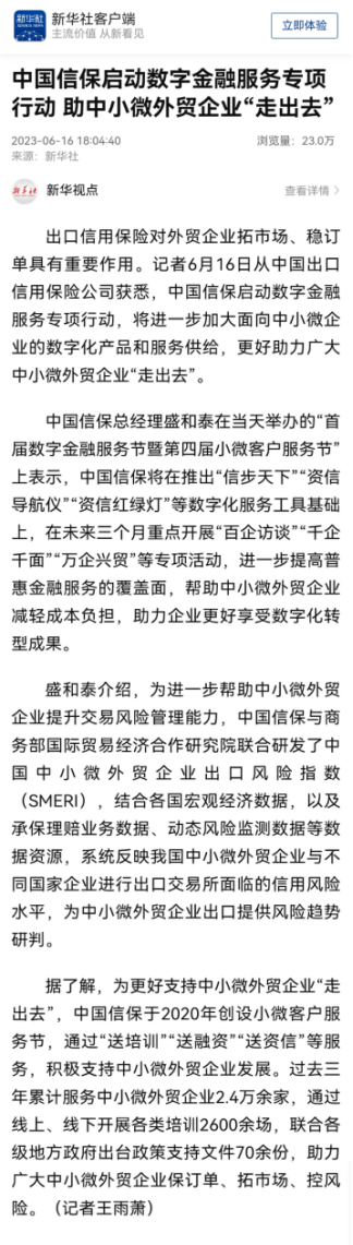 近日,中國信保舉行首屆數字金融服務節暨第四屆小微客戶服務節開幕式。《人民日報》、《人民日報(海外版)》、新華社、中央廣播電視總臺、《光明日報》、《經濟日報》、《國際商報》、《金融時報》、《中國銀行保險報》、新華網、中國網等媒體報道和轉載1152篇。多角度展示了中國信保作為政策性金融機構,近年來不斷加大普惠金融資源投入,深入實踐“數字+普惠”的服務理念,通過“百企訪談”“千企千面”“萬企興貿”等專項活動,與廣大中小微外貿企業分享中國信保“線上+線下+生態”的數字化轉型成果的舉措和成績。新聞媒體的集中報道彰顯了中國信保心懷“國之大者”、堅持“金融惠民”,堅定不移走中國特色金融發展之路的使命擔當。截至發稿時報道仍在持續中。以下部分報道內容和截圖: