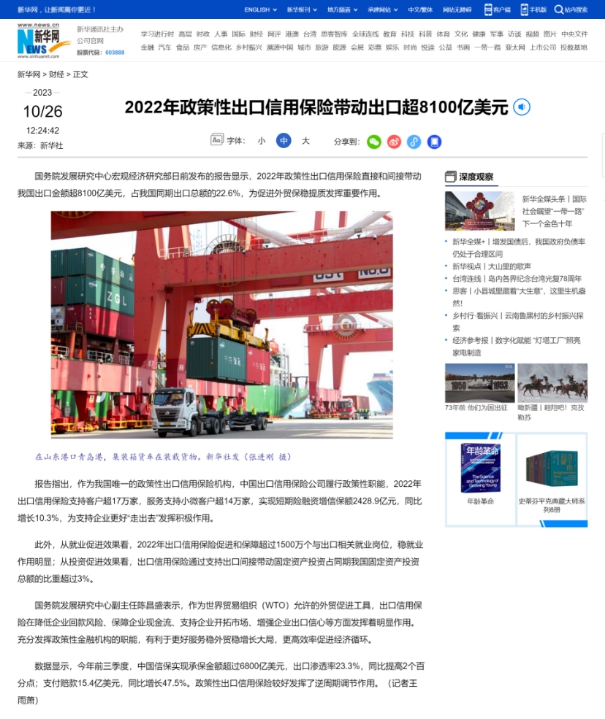 10月24日,國務(wù)院發(fā)展研究中心在京發(fā)布《中國出口信用保險(xiǎn)公司政策性職能履行評估報(bào)告(2022年度)》。人民日報(bào)、新華社、經(jīng)濟(jì)日報(bào)等多家中央媒體到場采訪。截至目前,《人民日報(bào)(海外版)》、新華社、《經(jīng)濟(jì)日報(bào)》、《金融時(shí)報(bào)》、《國際商報(bào)》、《中國銀行保險(xiǎn)報(bào)》、新華網(wǎng)和中國網(wǎng)等261家新聞媒體報(bào)道和轉(zhuǎn)載了中國信保履行政策性職能,充分發(fā)揮逆周期調(diào)節(jié)作用,助力穩(wěn)外貿(mào)穩(wěn)經(jīng)濟(jì)大盤、高質(zhì)量服務(wù)共建“一帶一路”、大力發(fā)展普惠金融、助力綠色金融發(fā)展等方面的主要情況,肯定了中國信保2022年堅(jiān)決貫徹落實(shí)習(xí)近平總書記關(guān)于充分發(fā)揮出口信用保險(xiǎn)作用的重要指示,按照黨中央、國務(wù)院決策部署,切實(shí)履行政策性職能,努力走好中國特色出口信用保險(xiǎn)發(fā)展之路,為推進(jìn)中國式現(xiàn)代化貢獻(xiàn)的信保力量。截至發(fā)稿時(shí),新聞媒體仍在持續(xù)報(bào)道中。以下是部分媒體的詳細(xì)報(bào)道和截圖: