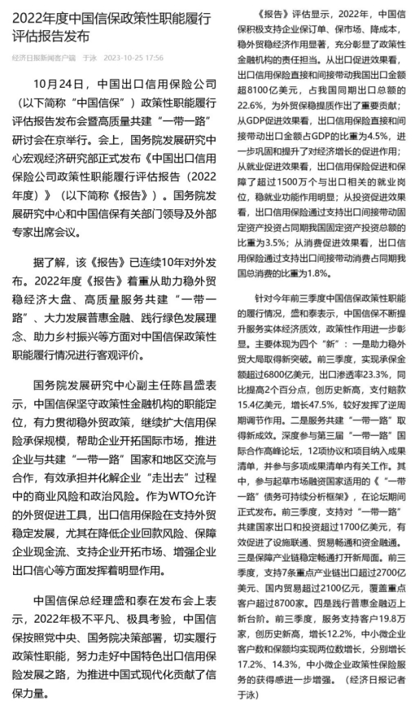 《經(jīng)濟(jì)日報(bào)》:2022年度中國信保政策性職能履行評估報(bào)告發(fā)布