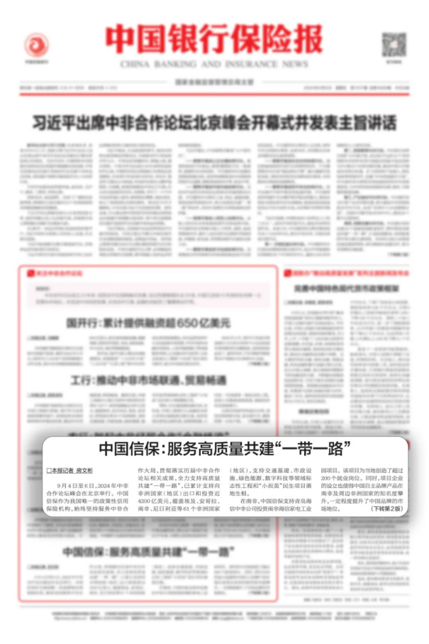 9月4日至6日,2024年中非合作論壇峰會在北京舉行。中國信保作為我國唯一的政策性信用保險機構,始終堅持服務中非合作大局,貫徹落實歷屆中非合作論壇相關成果,全力支持高質量共建“一帶一路”,已累計支持向非洲國家(地區)出口和投資近4200億美元,覆蓋埃及、安哥拉、南非、尼日利亞等61個非洲國家(地區),支持交通基建、市政設施、綠色能源、數字科技等領域標志性工程和“小而美”民生項目落地生根。